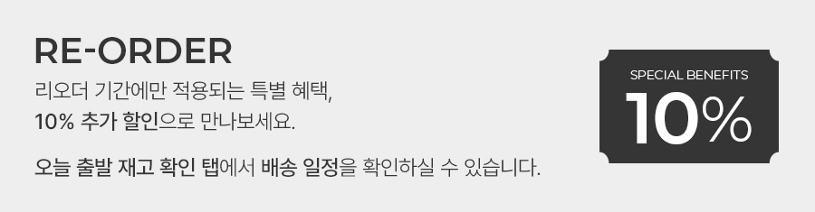 일부 재고가 확보되지 않은 상품의 경우 주문일로부터 2~3일 정도 준비기간 소요될 수 있습니다.