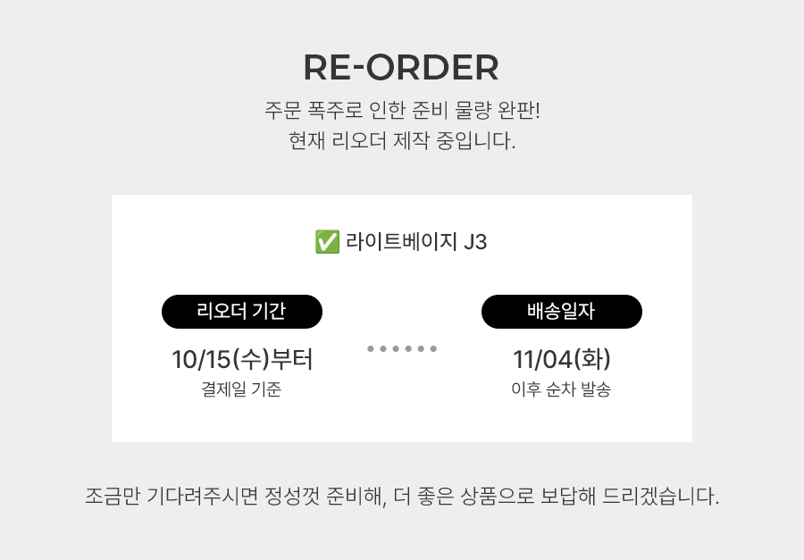 일부 재고가 확보되지 않은 상품의 경우 주문일로부터 2~3일 정도 준비기간 소요될 수 있습니다.