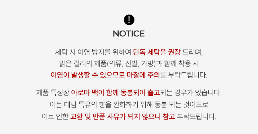 소재마다 가공 과정상의 특성상 특유의 냄새가 날 수 있습니다.