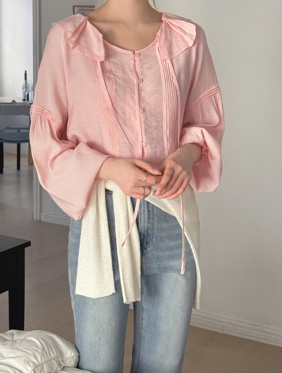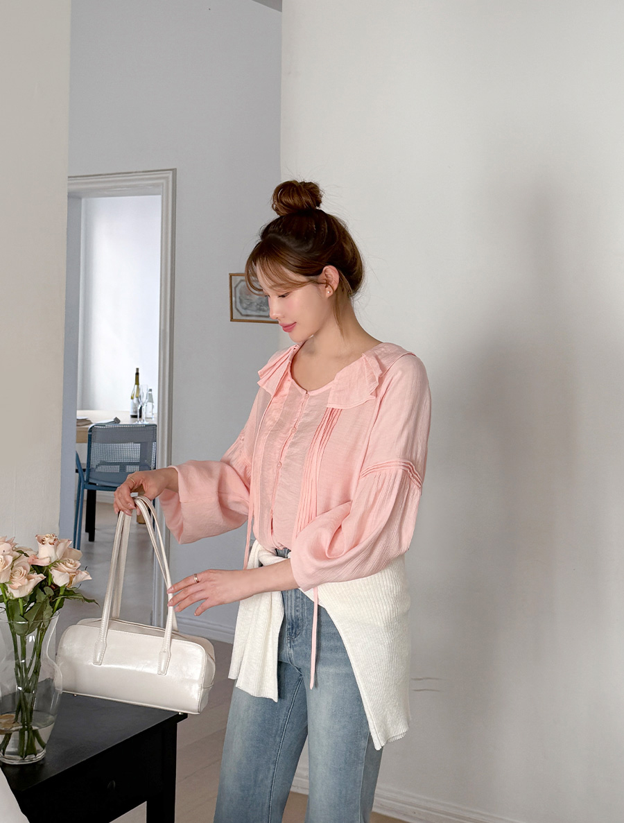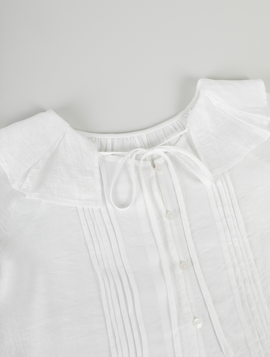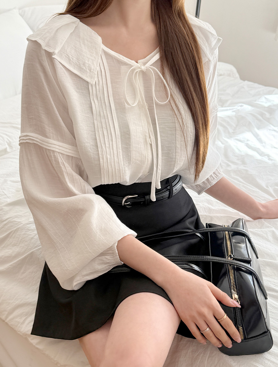 넥 프릴 디자인에 리본 스트랩 디테일을 넣어