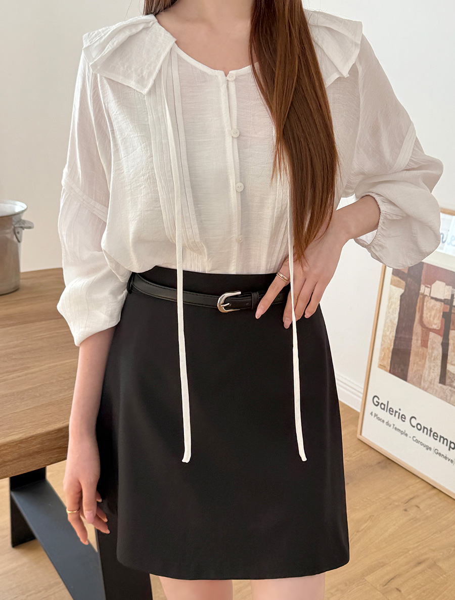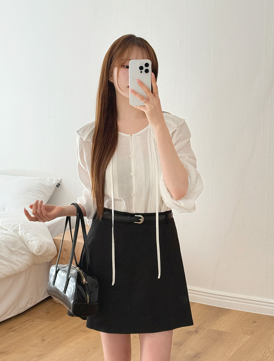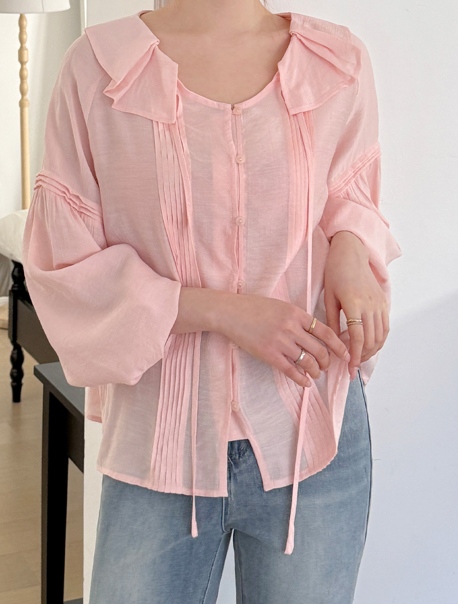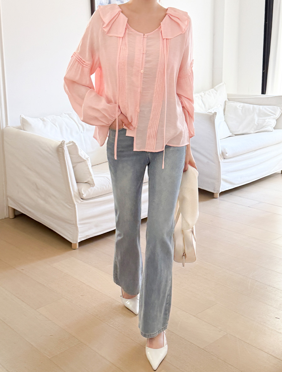 넥 프릴 디자인에 리본 스트랩 디테일을 넣어